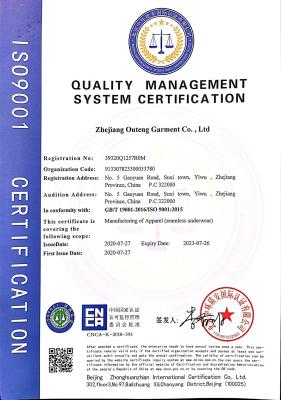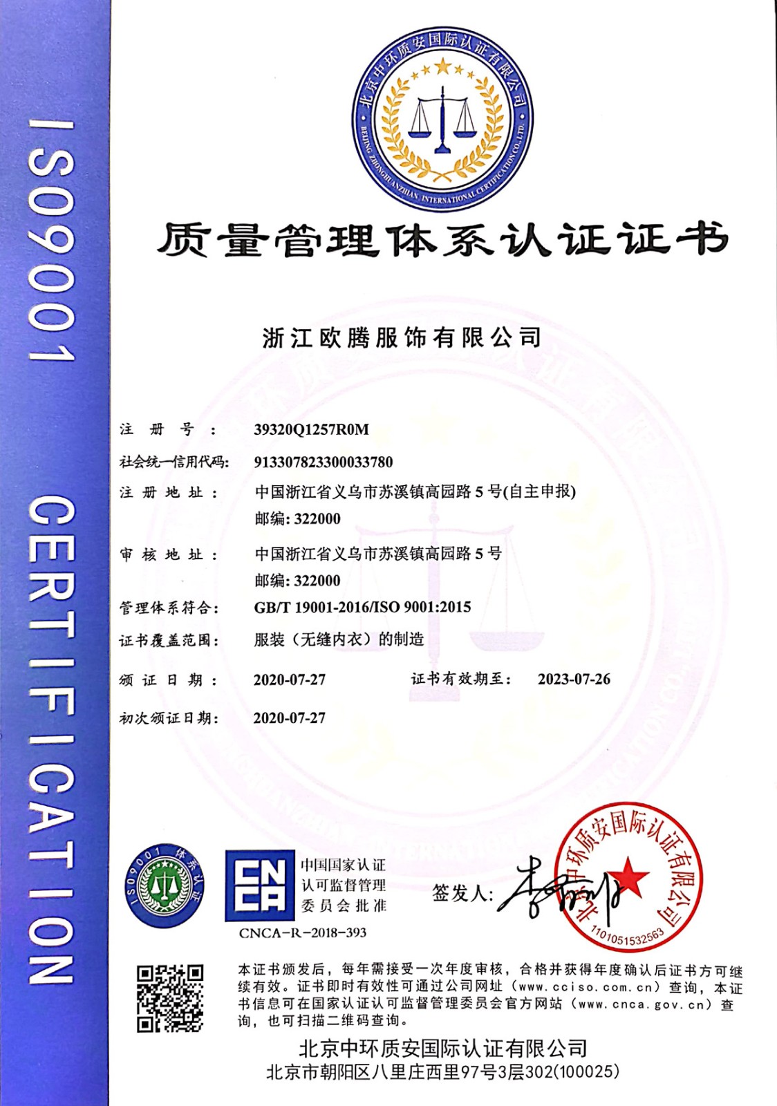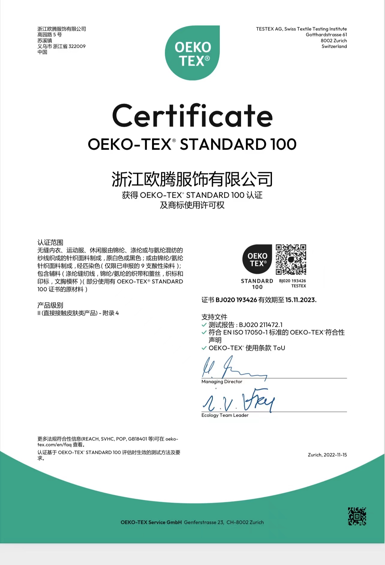 浙江歐騰服飾有限公司位于世界小商品之都-義烏。創(chuàng)立于2015年,是一家專業(yè)生產(chǎn)無縫針織運(yùn)動服飾和內(nèi)衣的工貿(mào)一體企業(yè),擁有自主出口權(quán)。 工廠的占地面積約16000平方米 ,引進(jìn)了大型圣東尼、高騰等多種先進(jìn)的制衣設(shè)備300余臺。月產(chǎn)能可達(dá)90萬件。 歐騰服飾每年投入近百萬資金打樣開發(fā)新產(chǎn)品,有著一支高素質(zhì)設(shè)計(jì)、技術(shù)員工隊(duì)伍。工廠先后通過了ISO 9001質(zhì)量管理體系認(rèn)證、BSCI認(rèn)證、GRS認(rèn)證、OEKO-TEX國際生態(tài)紡織品認(rèn)證等多項(xiàng)專利檢測報告。可提供OEM&ODM服務(wù)。歐騰服飾以一套完整、科學(xué)的質(zhì)量管理體系,生產(chǎn)的服裝從原材料紗線到成衣,質(zhì)量完全能夠滿足國內(nèi)、國際質(zhì)量要求。獲得了客戶一致好評。工廠先后獲得省科技型企業(yè)、國家高新企業(yè)、義烏市誠信講信用單位、規(guī)上企業(yè)、信用AAA級等榮譽(yù)。